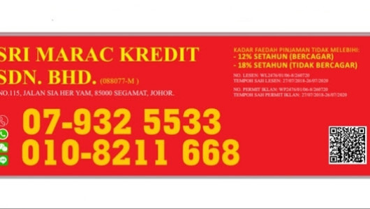 Alamat: NO 129 (TINGKAT ATAS, SRI MARAC KREDIT ( SEGAMAT ), Jalan Sia Her Yam, Kampung Abdullah, 85000 Segamat, Johor Darul Ta'zim, Malaysia.